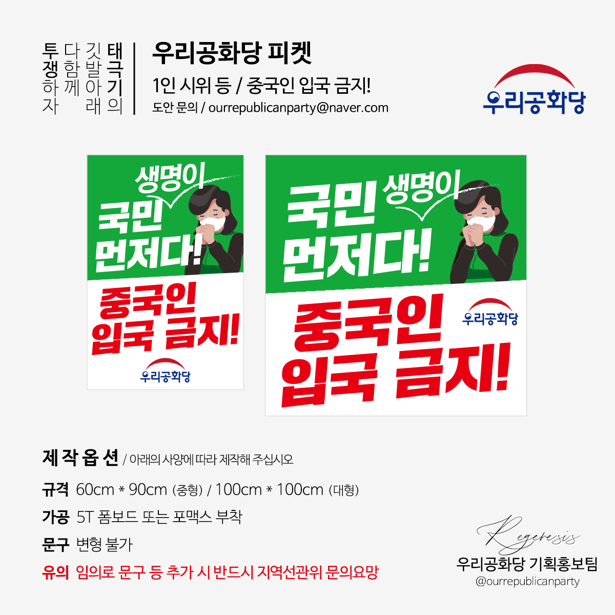 [ÇÇÄϵµ¾È] 1ÀνÃÀ§¿ë : ±¹¹Î »ý¸íÀÌ ¸ÕÀú´Ù! Áß±¹ÀÎ ÀÔ±¹ ±ÝÁö! / 60cm * 90cm(ÁßÇü) 100cm * 100cm(´ëÇü)
